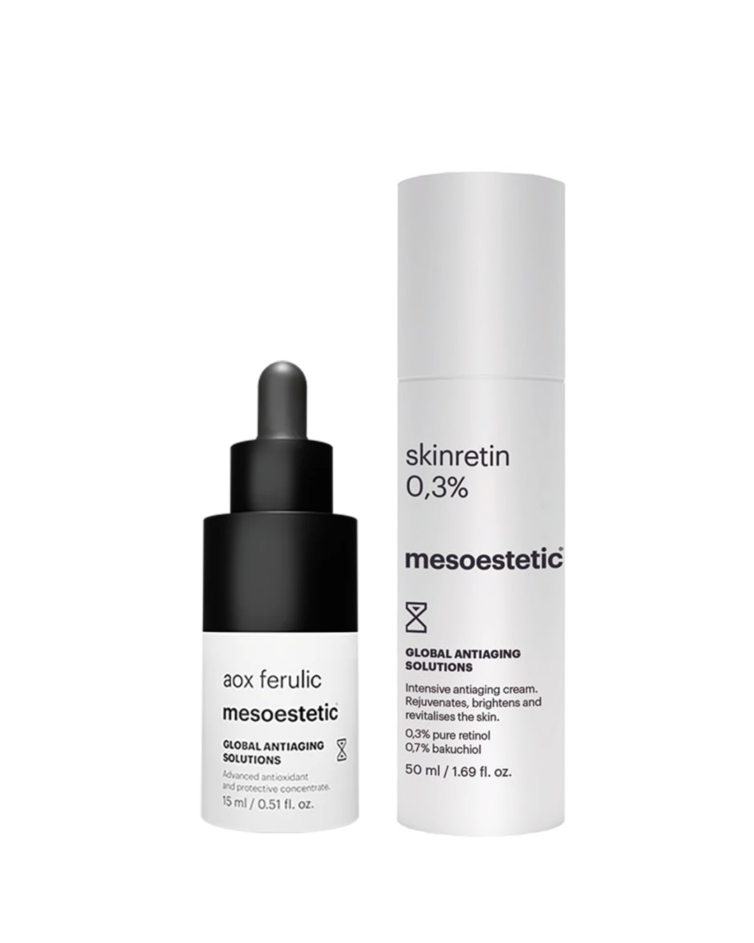 AOX Ferulic concentrate protects and revives the skin, while Skinretin 0,3% combines the power of pure retinol and bakuchiol to treat wrinkles, spots, loss of luminosity, and skin elasticity—a perfect duo for those seeking brighter, firmer skin!
