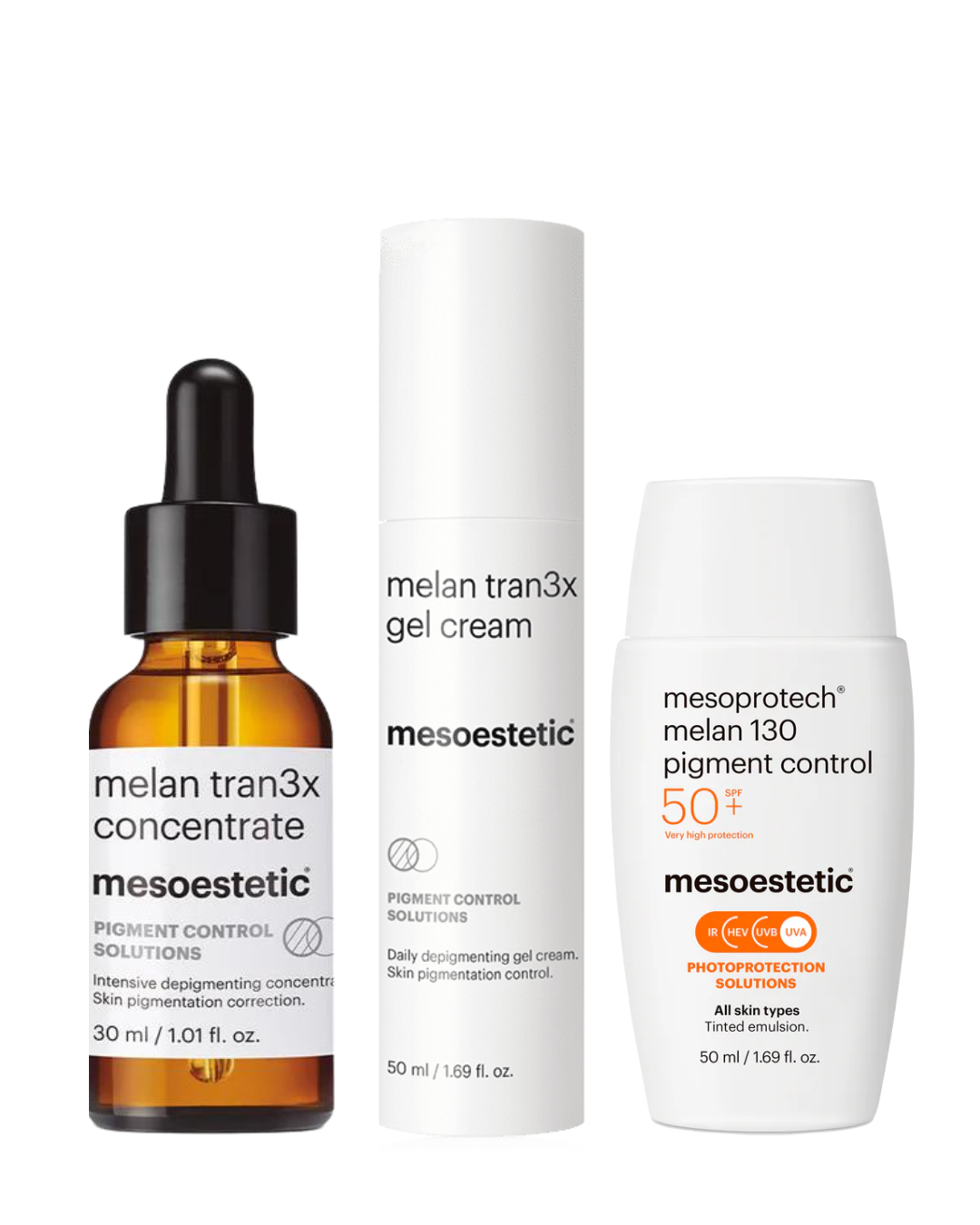mesoestetic® suggests daily use of melan tran3x gel cream and melan tran3x concentrate, two solutions designed to effectively reduce the appearance of skin spots with high skin tolerance, minimizing the risk of irritation or side effects.