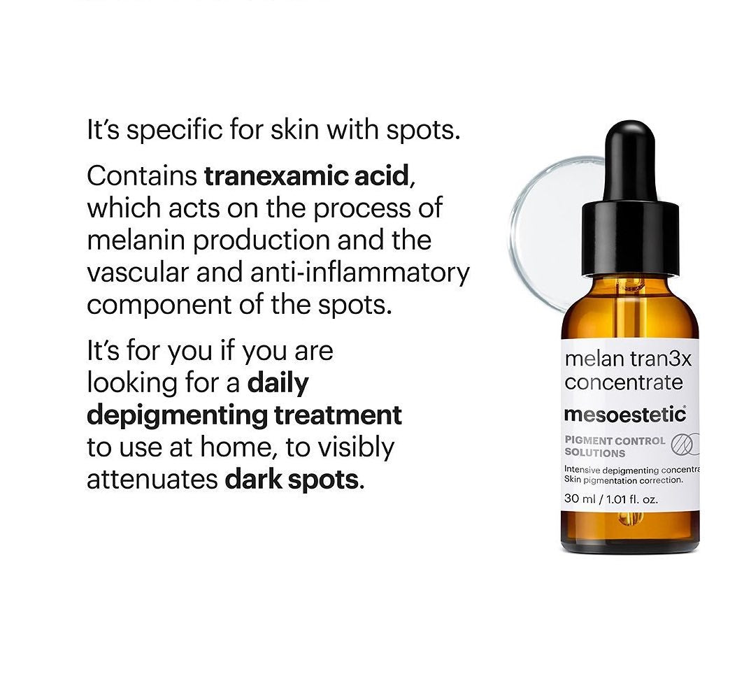 melan tran3x is the latest-generation of mesoestetic home depigmenting formulas to correct pigmentation imperfections.