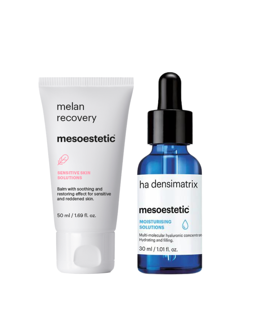 HA Densimatrix, a multi-format hyaluronic acid serum, intensely hydrates while Melan Recovery provides a calming and repairing booster to the skin.